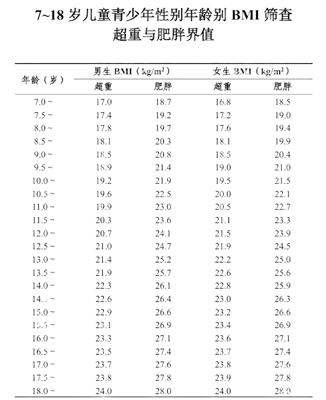 7~18岁儿童青少年以性别年龄别BMI作为筛查超重肥胖标准,家长可以借助对照表来帮孩子初步判断是否超重或肥胖。
